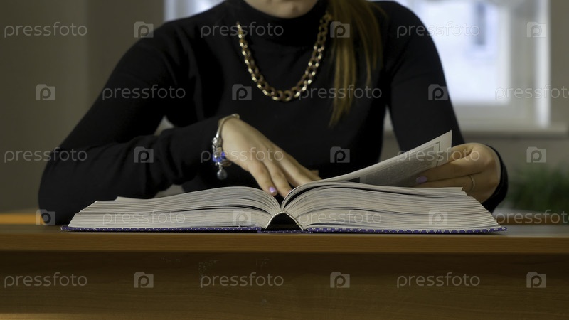 Женщина, сидящая за столом и листающая книгу