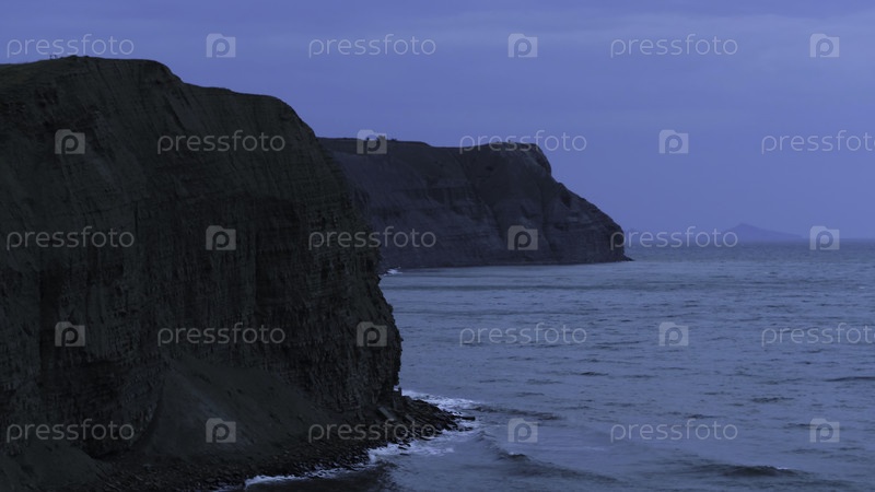 Потрясающий морской пейзаж с крутой скалой на темно-синем фоне неба.Вечер в море с небольшими волнами и скалами