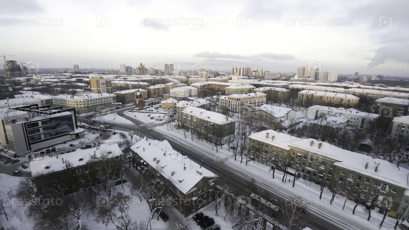 Клип. Зимний городской пейзаж с взглядом на улицу из воздуха. Клип. Небоскребы в городе. Городская жизнь. Удивительный городский ландшафт