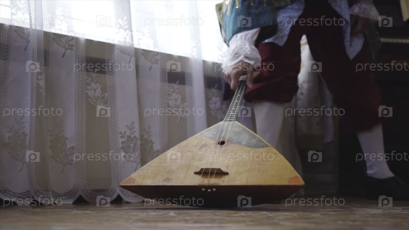 Деревянная балалайка в руках музыканта. Сток. Народное музыкальное искусство сельской традиции. Музыкант из прошлого с балалайкой
