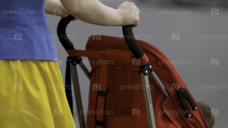 Молодая мать гуляет с детской колясочкой на улице задний вид вблизи