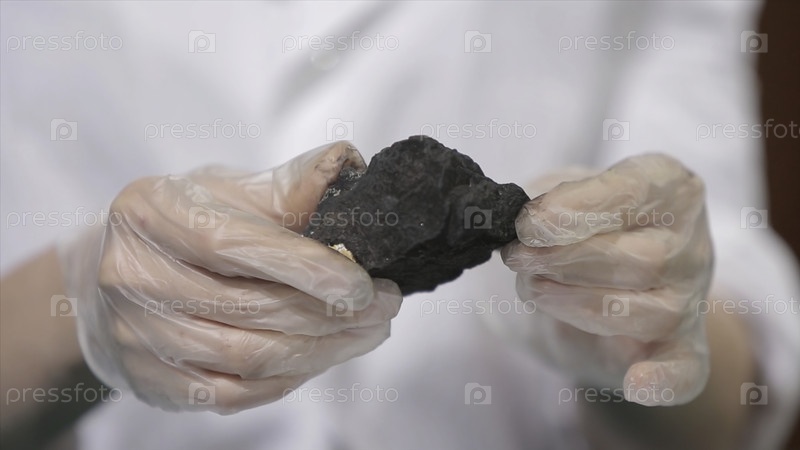Мужские руки в перчатках, держащие уголь. Ученый с образцом угля. Черный уголь в руке шахтера