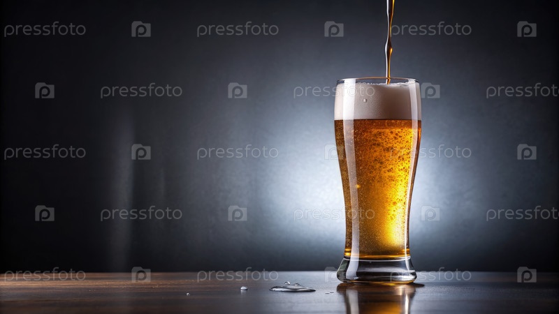 Пиво, заливаемое в стакан на деревянном столе с темным фоном
