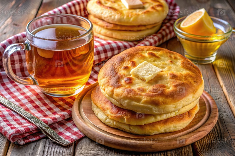 Золото-коричневые тортильи из дрожжевого теста, подаваемые на деревянной тарелке с чаем и лимоном