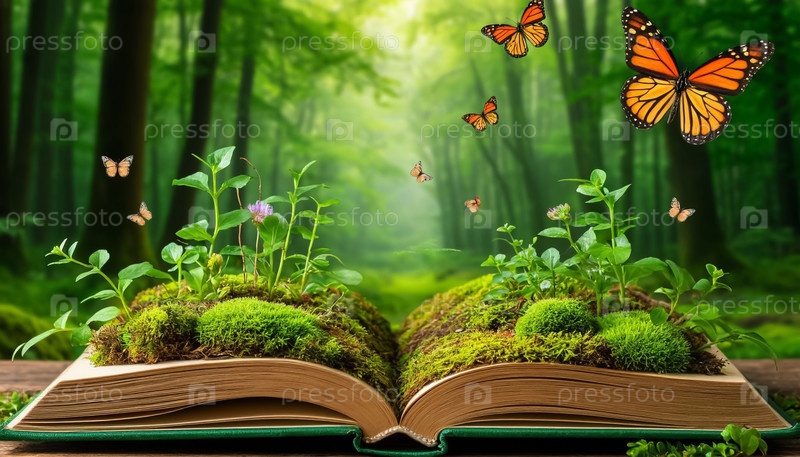 Открытая книга открывает волшебный лес, сюрреализм
