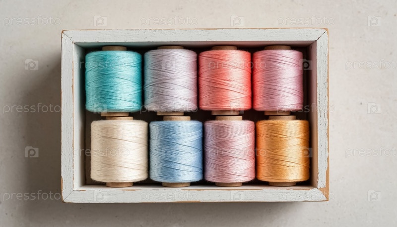Катушки пастельной швейной нити в белой деревянной коробке