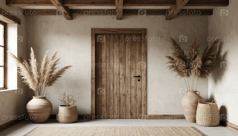 Минималистский элемент дизайна - сушеные цветы в больших вазах возле деревянной двери