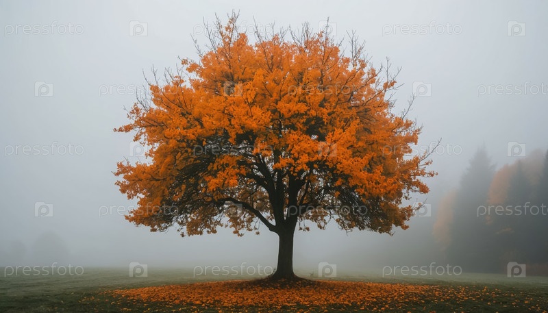 Одинокое апельсиновое дерево в туманном поле