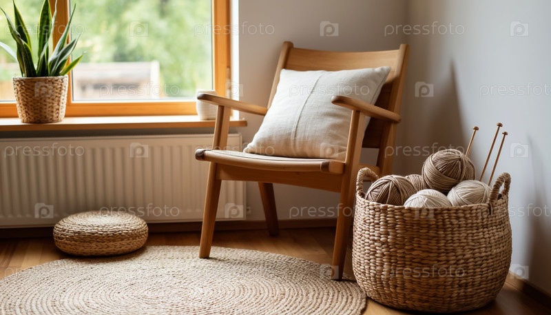 Уютный уголок ремесла в доме - стул и корзина с пряжей возле окна