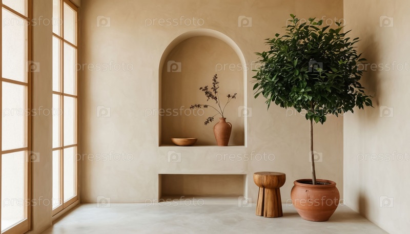 Деревянный стул и дерево в плантаторе на бежевой стене