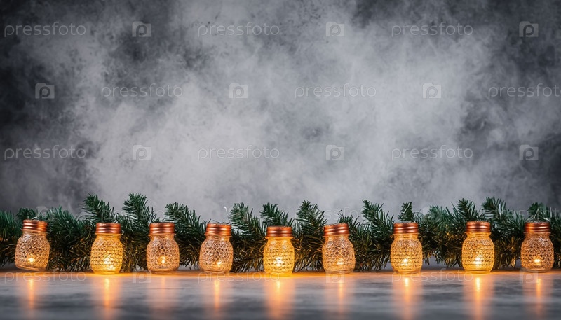 Рождественский фон с копировальным пространством и гирляндой светящихся мини-горшков