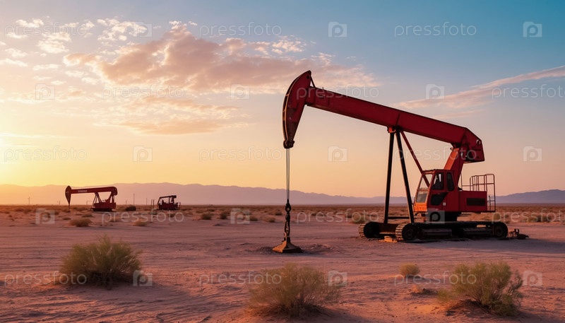 Пастельный пустынный пейзаж с силуэтами нефтяных насосов