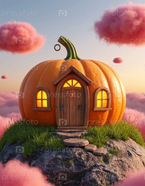 Тыквенный дом, плавающий в воздухе на острове среди розовых облаков