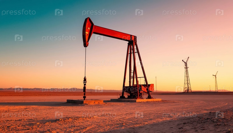 Пастельный пустынный пейзаж с силуэтами нефтяных насосов