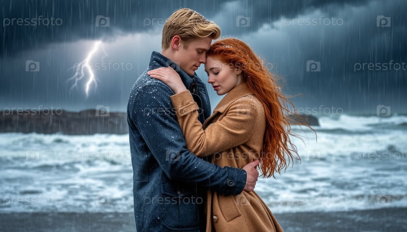 Влюбленная пара, он и она, обнимаются на берегу моря во время холодной бури