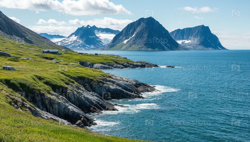 Океаническое побережье с высокими горами и зелеными холмами.Природа Исландии