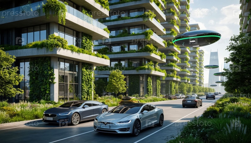 Футуристический город с нулевым выбросом углерода с вертикальными садами, солнечными батареями и летающими электромобилями