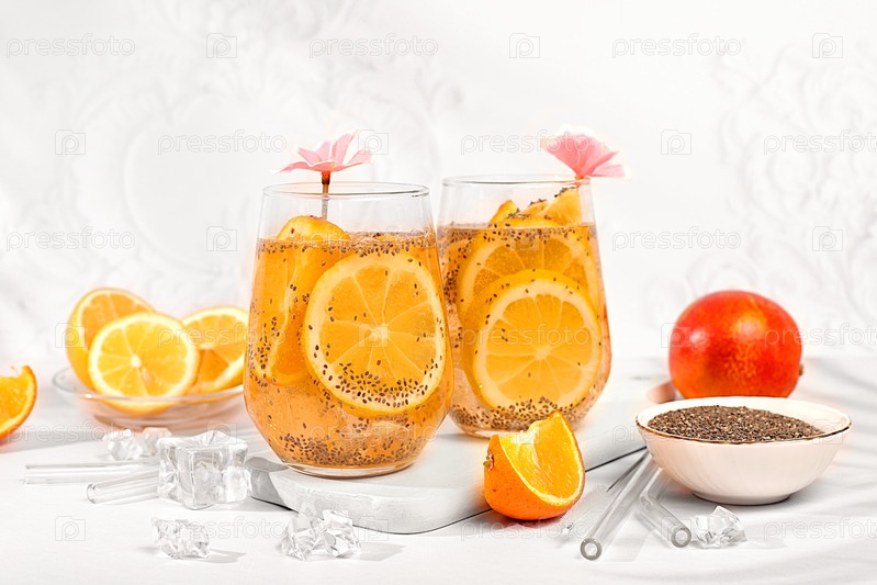 Современный натюрморт с цитрусовыми фруктами. Диетический веганский коктейль с семенами чиа, апельсином, лаймом, фиолетом и льдом. Концепция детоксикационной диеты и похудения. Летний баннер и шаблон экрана