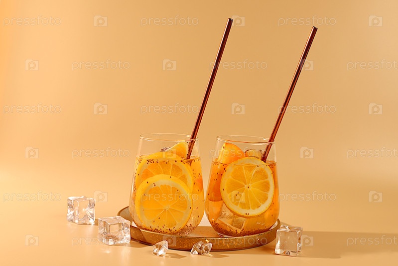 Современный натюрморт с цитрусовыми фруктами. Диетический веганский коктейль с семенами чиа, апельсином, лаймом, фиолетом и льдом. Концепция детоксикационной диеты и похудения. Летний баннер и шаблон экрана