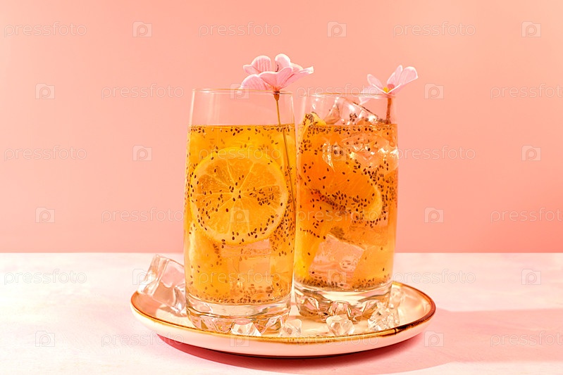 Современный натюрморт с цитрусовыми фруктами. Диетический веганский коктейль с семенами чиа, апельсином, лаймом, фиолетом и льдом. Концепция детоксикационной диеты и похудения. Летний баннер и шаблон экрана