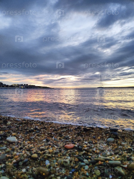 Драматическое закатное небо над галечным пляжем и спокойным морем, вечерний морской пейзаж на заднем плане, тихий океан обои