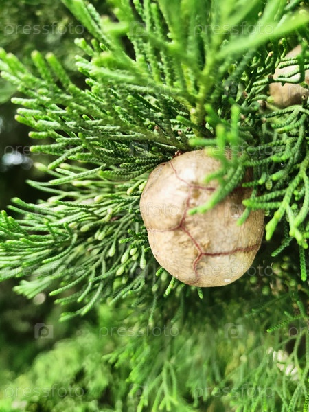 Зеленые ветви кипариса с конусом семян вблизи, естественный вечнозеленый фон, ботаническая обои листьев