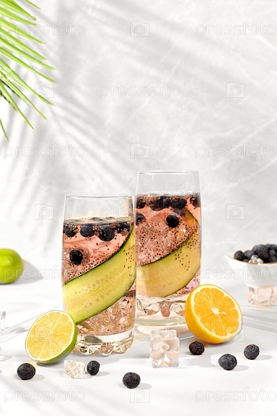 Диетический веганский коктейль с огурцом, лимоном, лаймом, черниками и семенами чиа, детоксикационная диета и концепция похудения, здоровый образ жизни и реклама здоровой пищи, меню кафе