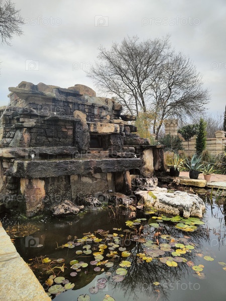 Каменный водопад с лилейным прудом в осеннем саду, тихий фон природы, стенограмма безмятежной воды
