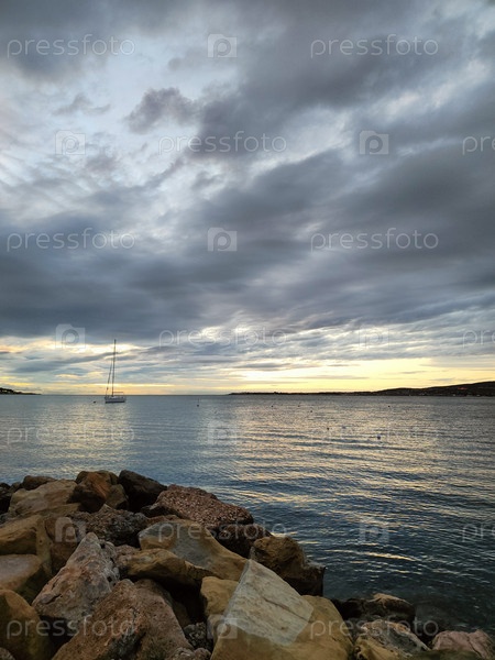 Драматическое облачное небо над спокойным морем и галечным пляжем, прибрежный морской пейзаж на заднем плане, безмятежная обои океана