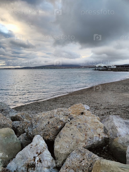 Драматическое облачное небо над спокойным морем и галечным пляжем, прибрежный морской пейзаж на заднем плане, безмятежная обои океана
