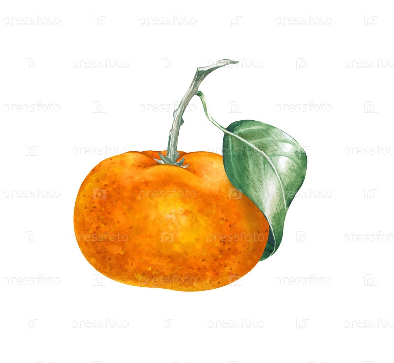 Акварельный цвет зрелой мандарины с веточкой и зеленым листьем. Ботаническая иллюстрация на изолированном фоне. Реалистичный клипарт оранжевых фруктов для тематики здоровой пищи, варенья, лимонад и урожая фермы