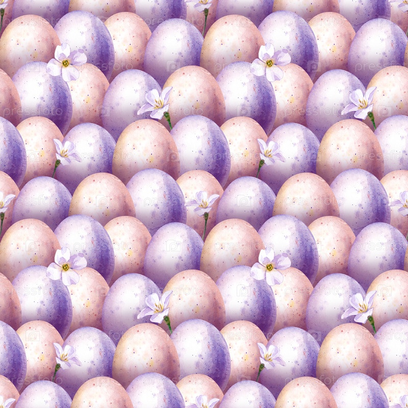 Весенний бесшовный рисунок с цветными яйцами с капельками краски и маленькими белыми цветками.Реалистичная акварельная иллюстрация для пасхальной и весенней темы