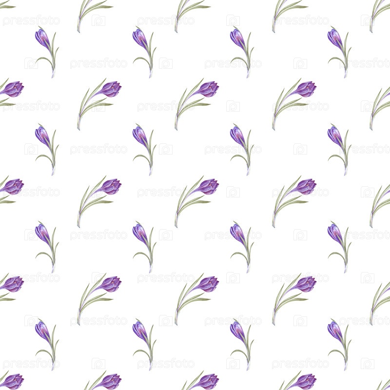 Бесшовный рисунок с фиолетовыми крокусами на изолированном фоне. Ботаническая акварельная иллюстрация с весенними первичками. Деликатный бесшовный цветочный фон для украшения темы весны и Пасхи