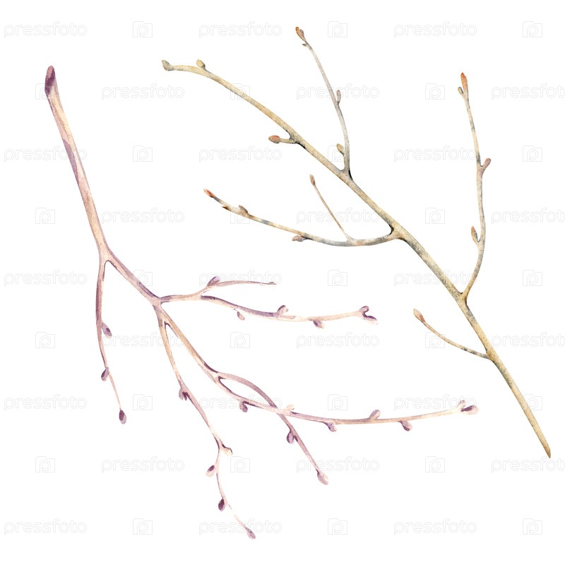 Две коричневые ветви безлистного дерева. Акварельная иллюстрация ботанического элемента на изолированном фоне. Клипарт голых веток с бутонами в натуральных цветах для дизайна осенних и весенних тем