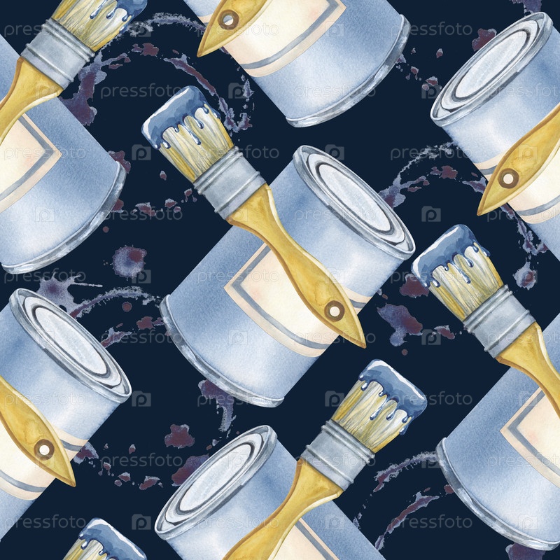 Бесшовный рисунок с баночками краски, щетками и пятнами голубой краски на темно-синем фоне. Иллюстрация акварели с рабочими инструментами для ремонта в натуральных цветах. Реалистичный фон для обоев, упаковки и печати, ремонтного бизнеса
