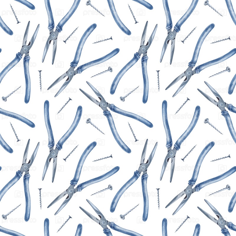 Акварельный бесшовный рисунок с мужскими рабочими инструментами. Клейки и самонакладывающиеся винты нарисованы вручную на изолированном фоне. Реалистичный, повторяющийся шаблон для проектирования услуг по ремонту дома и строительству