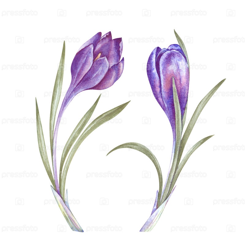 Набор с фиолетовыми цветами на изолированном фоне. Акварельная иллюстрация крокуса с длинными тонкими листьями. Реалистичный клипарт с весенними цветущими растениями для открыток, приглашений, свадеб, Пасхи