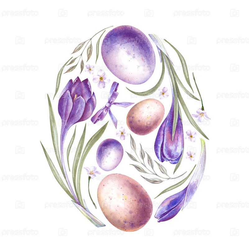 Весенняя композиция в форме пасхального яйца. акварельная иллюстрация на изолированном фоне. реалистичное изображение с цветными яйцами, крокусами и белыми цветками для украшения Пасхи, открыток, приветствий и приглашений