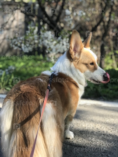 Счастливый рыжеволосый корги на прогулке