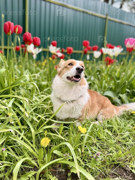 Счастливый рыжеволосый корги на прогулке