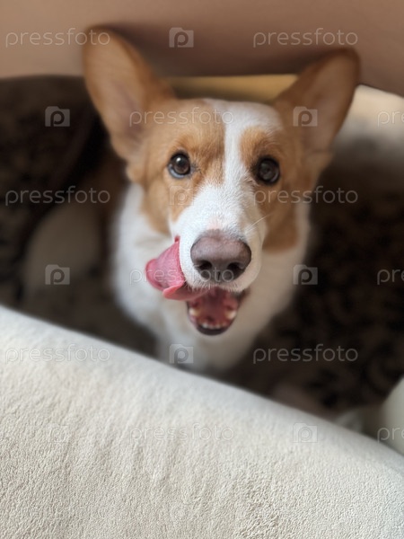 Милый счастливый корги ближайший план, сидящий дома