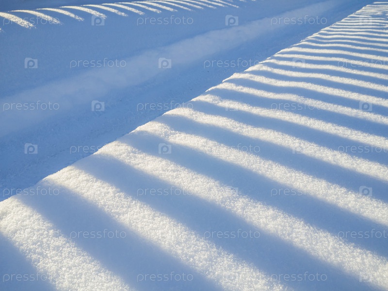 Длинные линии теней, брошенных через нетронутое белоснежное поле с искрящимся светом. естественный зимний пейзаж фон и текстура. абстрактный рисунок