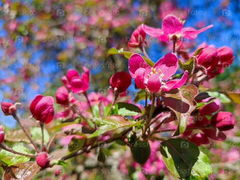 Ярко-розовые яблочные цветки цветут на ветке дерева против голубого неба, символизируя весеннюю природу и рост