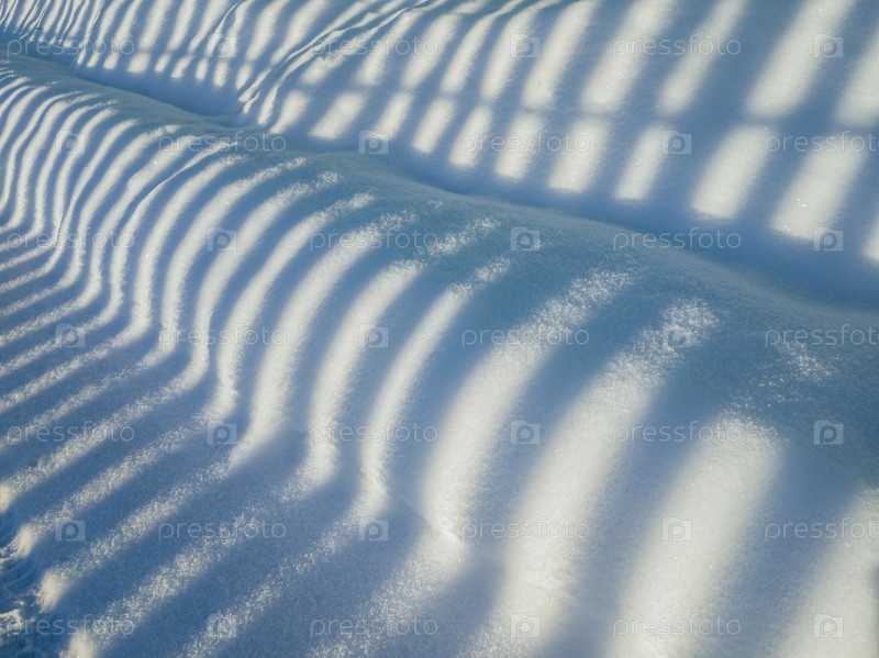 Длинные линии теней, брошенных через нетронутое белоснежное поле с искрящимся светом. естественный зимний пейзаж фон и текстура. абстрактный рисунок