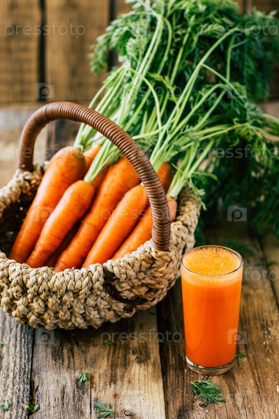 Свежая, молодая морковь с ботвой, морковный сок