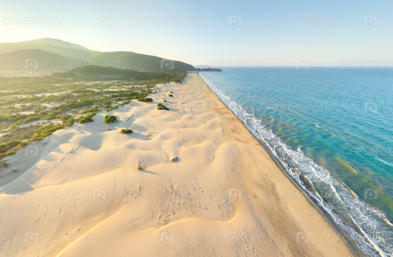 Гелемис, Турция. утренние тени на песчаных дюнах пляжа Патара, рисунки волн на берегу, долгая береговая линия в летнем свете восхода солнца. вид с воздуха