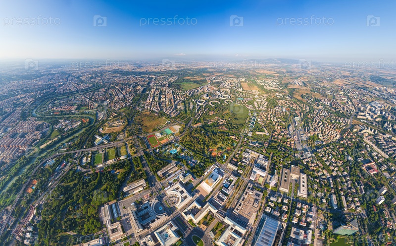 Рим, Италия. Всемирный выставочный квартал - EUR. Панорама города летом утром. Солнечная погода. Вид с воздуха