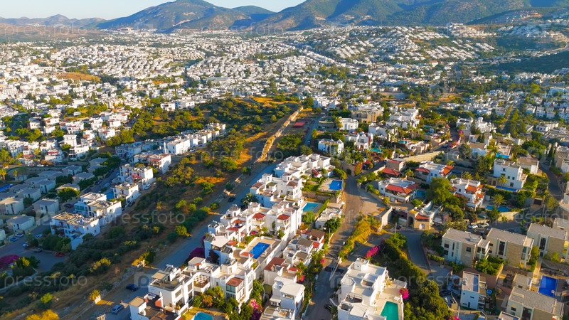 Вид из воздуха на древние городские стены Галикарнасса с белыми домами, зелеными деревьями и холмами в историческом районе Бодрума
