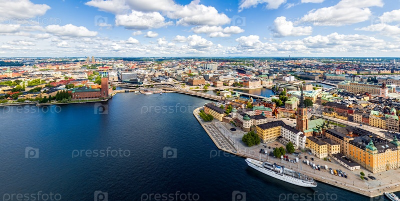 Стокгольм, Швеция.Риддархольмен.Панорама города летом в пасмурную погоду.Вид с воздуха