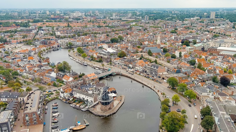 Ветряная мельница De Adriaan (1779). ветряная мельница XVIII века. панорамный вид на центр города Haarlem. облачная погода в течение дня. лето, Aerial View